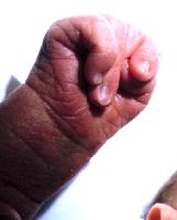 - Hands are often clenched into fists, with their index finger overlapping their other fingers.