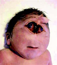 - Severe mental deficiency. Small head, failure of the brain to divide into halves during gestation.
