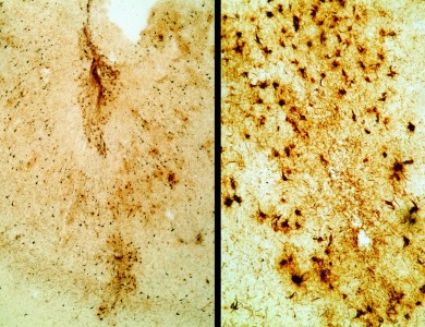 Abundant tau immunoreactive neurofibrillary tangles (dark brown dots) in the cerebral cortex in a pattern unique to chronic traumatic encephalopathy (CTE)