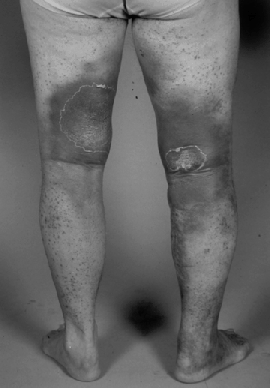 In adults, hairs become fragmented, purpura (bleeding) into the skin, beginning on the backs of the lower limbs coalescing to become ecchymoses ; hemorrhage into the muscles of the arms and legs. Haemorrhages into joints; splinter haemorrhages in the nail beds; gum involvement (only in people with teeth) that includes swelling, friability, bleeding, secondary infection, and loosening of the teeth; poor wound healing and breakdown of recently healed wounds; petechial hemorrhages in the viscera; and emotional changes. In the later stage – icterus, oedema, and fever are common, and convulsions, hypotension, and death may occur abruptly. Anaemia is common and is due to bleeding into tissues.