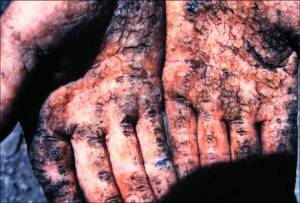CLINICAL FEATURESAcute arsenic poisoning from ingestion results in increased permeability of small blood vessels and inflammation and necrosis of the intestinal mucosa; these changes manifest as hemorrhagic gastroenteritis, fluid loss, and hypotension. Delayed cardiomyopathy accompanied by electrocardiographic abnormalities may develop. Symptoms include nausea, vomiting, diarrhea, abdominal pain, delirium, coma, and seizures. A garlicky odor may be detectable on the breath. Acute tubular necrosis and hemolysis may develop. The reported lethal dose of arsenic ranges from 120 to 200 mg in adults and is 2 mg/kg in children. Arsine gas causes severe hemolysis within 3 to 4 h of exposure and can lead to acute tubular necrosis and renal failure.In chronic arsenic poisoning, the onset of symptoms comes at 2 to 8 weeks. Typical findings are skin and nail changes, such as hyperkeratosis, hyperpigmentation, exfoliative dermatitis, and Mees’ lines (transverse white striae of the fingernails); sensory and motor polyneuritis manifesting as numbness and tingling in a “stocking-glove” distribution, distal weakness, and quadriplegia; and inflammation of the respiratory mucosa.Epidemiologic evidence has linked chronic consumption of water containing arsenic at concentrations in the range of 10 to 1820 ppb with vasospasm and peripheral vascular insufficiency culminating in “blackfoot disease – a gangrenous condition affecting the extremities.Chronic arsenic exposure has also been associated with a greatly elevated risk of skin cancer and possibly of cancers of the lung, liver (angiosarcoma), bladder, kidney, and colon. |