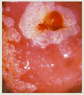 Typical papilliferous warts (condyloma acuminata) affecting the cervix. |