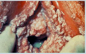 Typical papilliferous warts (condyloma acuminata) affecting the vulva and vagina. |