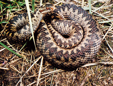 | The common addar or common European viper, is a poisonous snake like all other vipers. Its bite is rarely fatal and this snake is less aggressive. It is the only poisonous snake found in Great Britain. |