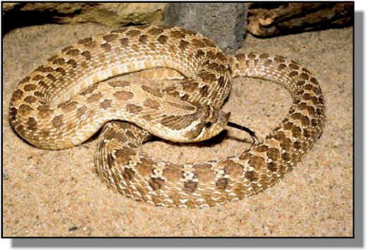 | Hognose snakes, also called puff adders, spreading adders, or hissing adders, rarely even bite; these snakes puff up and hiss wildly when disturbed. | Western Hognose Snake![]() |