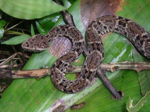 A fer-de-lance snake strikes swiftly and is an aggressive snake. During the day the snake lies coiled, blending with its surroundings, but it is especially dangerous after sunset, when it wanders in search of prey.