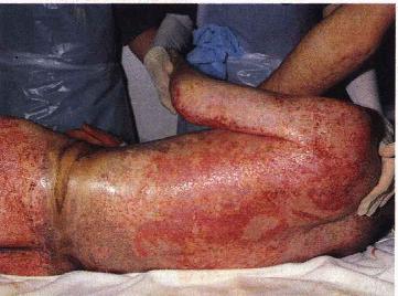 The effect of mustard agent is delayed and the first symptoms do not occur until 2-24 hours after exposure. A typical result of warfare with mustard agent is that the medical system is overloaded with numerous victims who require long and demanding care. |