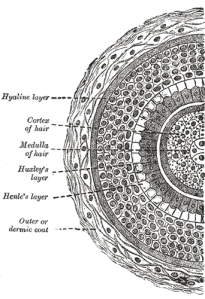 The strand of hair is made of the medulla, cortex and the cuticle. The cortex, or middle layer of the hair, is the primary source of mechanical strength. The cortex contains melanin which gives colour to the hair. The colour depends on the number, distribution and the type of melanin granules. |